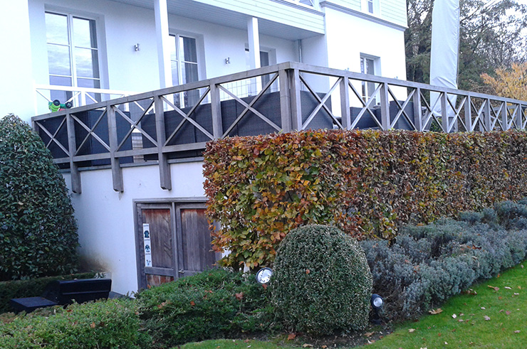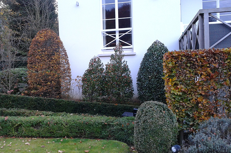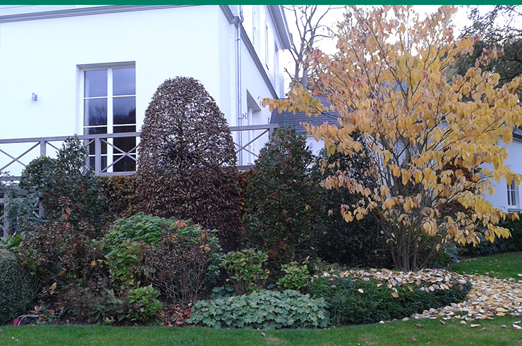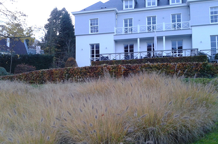 Le choix de végétaux de grandes tailles aux abords des façades a permis de bien assoir la maison sur le terrain tout en rééquilibrant les proportions.